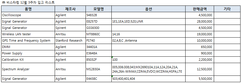 [비스타컴] 12월 3주차 입고 장비 리스트