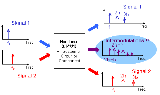 ¾ÕÀý¿¡¼ º¸¼ÌµíÀÌ, ¿ì¸®°¡ ÁÖ·Î ¸»ÇÏ´Â HarmonicÀ̶õ ³ðÀº ºñ¼±Çü ½Åȣ󸮰úÁ¤¿¡¼ ¹ß»ýÇÏ´Â »õ³¢Á֯ļöµéÀÔ´Ï´Ù. IntermodulationÀ̶õ, ºñ¼±Çü ¼ÒÀÚ¸¦ ÅëÇÑ RF½Åȣó¸® °úÁ¤¿¡¼, µÎ °³ÀÇ ´Ù¸¥ ÀÔ·Â Á֯ļö½ÅÈ£ÀÇ harmonic Á֯ļöµé³¢¸®ÀÇ ÇÕ°ú Â÷·Î Á¶ÇÕµÈ Ãâ·ÂÁ֯ļö ¼ººÐÀÌ ³ª¿À´Â Çö»óÀ» ¸»ÇÕ´Ï´Ù. Áï ÇϳªÀÇ RF½ÅÈ£°¡ ó¸®µÇ¸é¼ ³ªÅ¸³ª´Â°Ô ¾Æ´Ï¶ó µÎ °³ ÀÌ»óÀÇ Á֯ļö ½ÅÈ£°¡ µ¿½Ã¿¡ ó¸®µÉ ¶§ ³ªÅ¸³ª´Â Çö»óÀÔ´Ï´Ù. ±×¸®°í ±×·¯ÇÑ °ÍµéÀº ¿ø·¡ ½ÅÈ£¿¡ ¹æÇصǴ ¿Ö°î¿ä¼Ò·Î¼, ±× °á°ú¹°µéÀ» ¿ì¸®´Â ÈçÈ÷ IMD (Intermodulation Distortion)À̶ó°í ºÎ¸¨´Ï´Ù. ÀÚ!!! Á¤ÀÇ´Â ÀÌ·¸´ÙÄ¡°í ÀÌÁ¦ºÎÅÍ ÀÌ IntermodulationÀÇ Á¤Ã¼¸¦ Â÷±ÙÂ÷±Ù ÀÌÇØÇØº¸Áö¿ä!