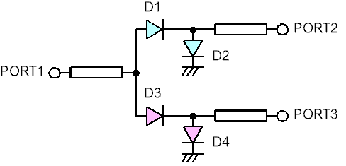 <±×¸² 5£19> SPDT Switch (Á÷·Ä + º´·Ä) ÀÌ È¸·Î¿¡¼ port 1¿¡¼ port 2·Î ½ÅÈ£¸¦ Àü´ÞÇÏ´Â ½Ã¹Ä·¹À̼ÇÀ» ¼öÇàÇÏ¿´½À´Ï´Ù. °¢ ´ÙÀÌ¿ÀµåÀÇ »óÅ´ À§ÀÇ µµÇ¥¸¦ ÂüÁ¶ÇϽñ⠹ٶó¸ç, ½Ã¹Ä·¹ÀÌ¼Ç °á°ú´Â <±×¸² 5-20>¿¡ ³ªÅ¸³»¾ú½À´Ï´Ù.