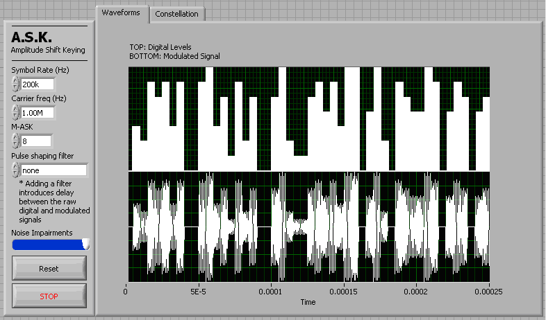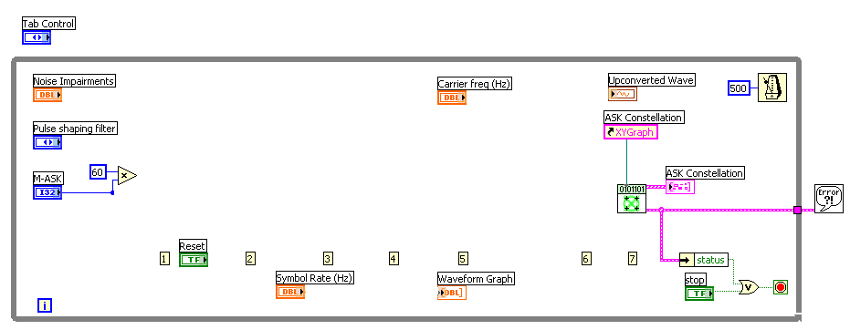 ¸¶Áö¸·À¸·Î, °¢ VIÀÇ Error OutÀ» ´ÙÀ½ VIÀÇ Error In¿¡ ¿¬°áÇÏ¿© ¹ß»ýÇÏ´Â ¿À·ù¸¦ ó¸®Çϰí VI °£ µ¥ÀÌÅÍ È帧À» Á¤ÀÇÇÕ´Ï´Ù. ÇÁ·±Æ®ÆÐ³Î·Î µ¹¾Æ°¡¼ VI¸¦ ½ÇÇàÇÏ¿© ASK º¯Á¶ÀÇ ÀÛµ¿ »óŸ¦ È®ÀÎÇÕ´Ï´Ù. M-ASK, pulse shaping filter ¹× Noise impairments ÄÁÆ®·ÑÀÇ °ªÀ» ¹Ù²ãº¾´Ï´Ù. ÀÌ °£´ÜÇÑ ¼Û¼ö½Å±â´Â ÁøÆø ÆíÀÌ º¯Á¶¸¦ ÀÌ¿ëÇÑ º¯Á¶ ¹× º¹Á¶¸¦ º¸¿©ÁÝ´Ï´Ù.