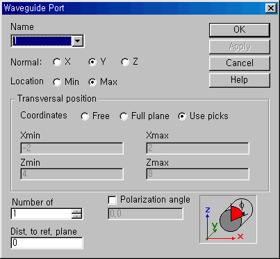 4. Port ¼³Á¤ MWSÀÇ Æ÷Æ® ¼³Á¤¹ýÀº ´Ù¸¥ 3D tool°ú °°Àº ¿ø¸®°¡ Àû¿ëµÇ¸ç, ¸éÂï±â ±â´ÉÀ» ÀÌ¿ëÇÏ¿© ¼³Á¤ÇÑ´Ù. ÀÏ´Ü »ó´ÜÀÇ Pick face ¾ÆÀÌÄÜÀ» ¼±ÅÃÇÑ ÈÄ(1) Æ÷Æ®·Î »ï°íÀÚ ÇÏ´Â ºÎºÐÀ» ¸¶¿ì½º·Î Ŭ¸¯Çϸé(2) ¾Æ·¡ ¿À¸¥ÂÊ ±×¸²°ú °°ÀÌ »¡°£ Á¡µéÀÌ ÂïÈ÷¸é¼ ¼±ÅõȴÙ. ±×ÈÄ »ó´Ü¿¡¼ Waveguide Ports ¾ÆÀÌÄÜÀ» ¼±ÅÃÇϸé(3) Æ÷Æ®°¡ ÁöÁ¤µÈ´Ù. (1) Waveguide Port¸¦ ¼±ÅÃÇÏ¸é ¿ì¼± ¾Æ·¡¿Í °°ÀÌ Æ÷Æ®Á¶Àý ¸Þ´º°¡ ³ª¿À´Âµ¥, Ưº°È÷ mode °¹¼ö¸¦ Á¶Á¤Çϰųª ¹Ì¼¼ÇÏ°Ô Æ÷Æ® Å©±â¸¦ Á¶Á¤ÇÒ °Í-ÀÌ ¾Æ´Ï¶ó¸é ±×³É default °ªÀ» »ç¿ëÇÏ¸é µÈ´Ù. OK¸¦ ´©¸£°í ³ª¸é ¾Æ·¡ ±×¸²Ã³·³ ȸ鿡 »¡°£ ³×¸ð Çü»óÀ¸·Î Æ÷Æ®°¡ ³ªÅ¸³´Ù.