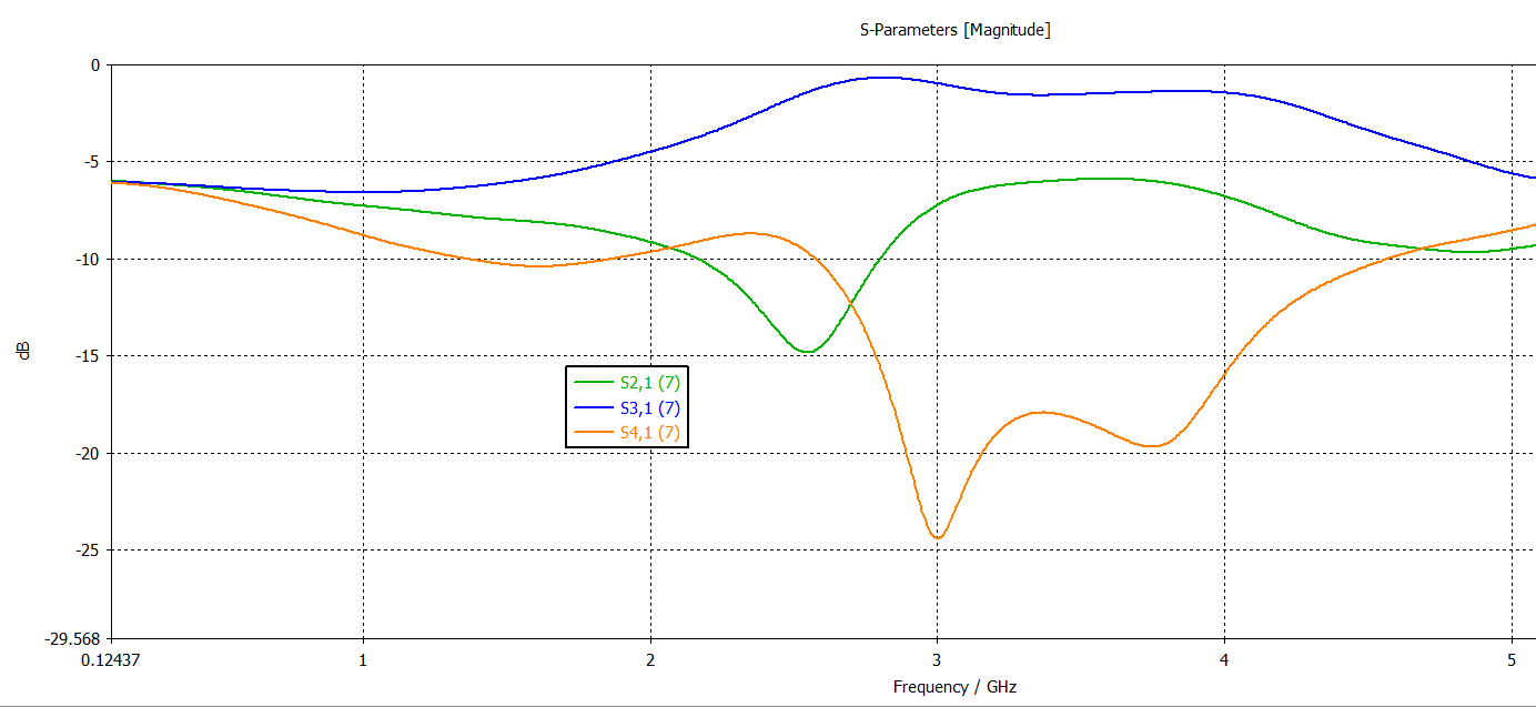 S_41에서 isolation과 S_21, S31에서 -3dB특성도 뚜렷하게 잘 보이지 않습니다.