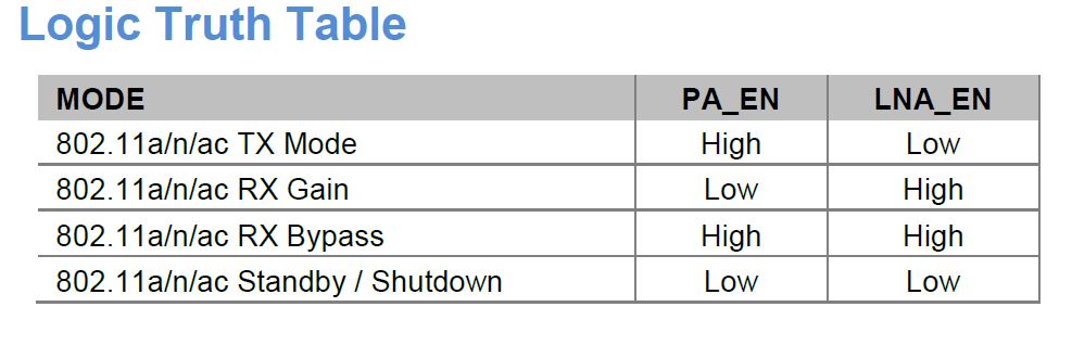 Logic table을 보니 Wi-Fi FEM(PA + LNA + SW)을 참고 하시나 보네요.