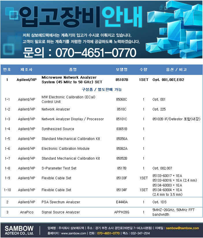 1. Agilent/HP / Microwave Network Analyzer System (45 MHz to 50 GHz) SET / 85107B / 1SET / Opt. 001,007,EB2