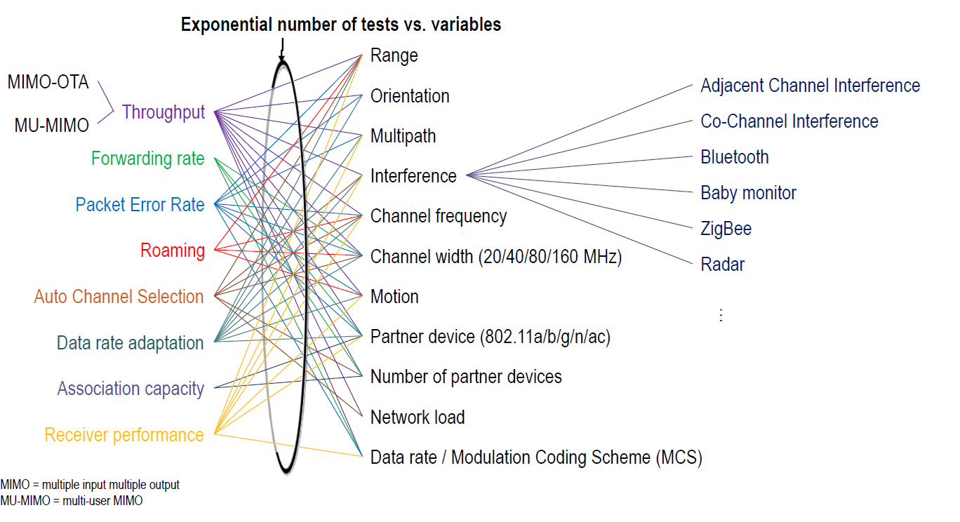 MU-MIMO 성능측정 및 OTA측정이 가능하며 PAL을 이용한 Packet Capture/AP Emulation/Client Emulation등이 가능하고, iGen을 이용하여 인위적인 Interference(Bluetooth/BLE, RADAR, 전자레인지, Baby Monitor, 802.11 FHSS, ZigBee, Pulse, Wave, Frequency Sweep 등) 만들어 낼 수 있어서 완전하게 차폐된 챔버(Chamber) 내에서 실생활에서 나타날 수 있는 간섭환경을 만들수 있습니다.