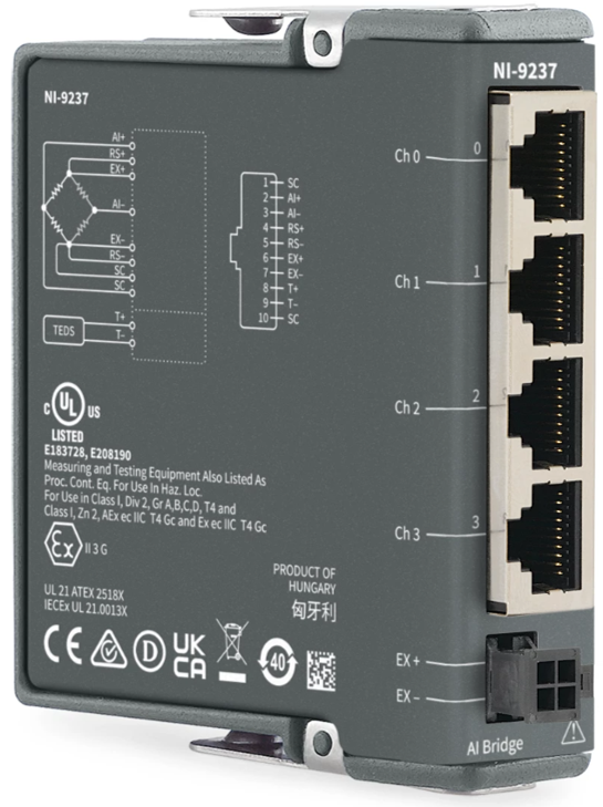 NI-9237은 최대 4개의 브리지 기반 센서에 전원을 공급하고 측정하는 데 필요한 모든 신호 컨디셔닝 기능을 갖추고 있습니다. 이 모듈을 사용하면 채널 간 위상 지연 없이 스트레인 또는 로드 측정을 수행할 수 있습니다. 또한 60 VDC 절연 및 1,000 Vrms 과도 절연 기능을 제공하므로 높은 공통 모드 노이즈 제거와 높은 안전성을 제공합니다. NI-9237은 내장 구동형 하프 브리지 및 풀 브리지 센서와 함께 사용하도록 프로그래밍할 수 있습니다. 4개의 RJ50 잭은 대부분의 토크 또는 로드 셀을 직접 연결하며, 최소의 도구로 사용자 정의 케이블 솔루션 구현을 지원합니다.