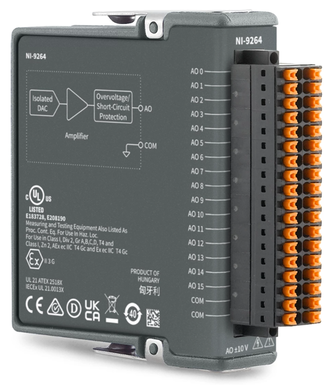NI-9264는 다채널 시스템을 수용하며 동시 업데이트되는 아날로그 출력 모듈입니다. 높은 채널 수를 지원하는 모듈은 섀시의 공간을 절약해 여분의 공간을 다른 유형의 측정에 활용할 수 있습니다. 각 채널에는 전용 디지털-아날로그 컨버터가 있습니다. NI-9264의 스프링 터미널 버전은 36핀 커넥터를 출력 채널에 사용하며, 각 채널은 접지되어 있습니다.
