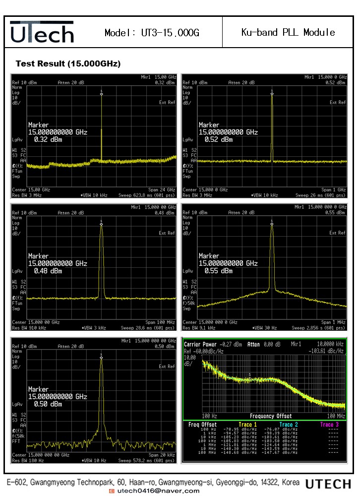 신규 **Ku-band PLL Module (모델명: UT3-15.000G)**의 상세 스펙과 실측 데이터를 소개해 드립니다.