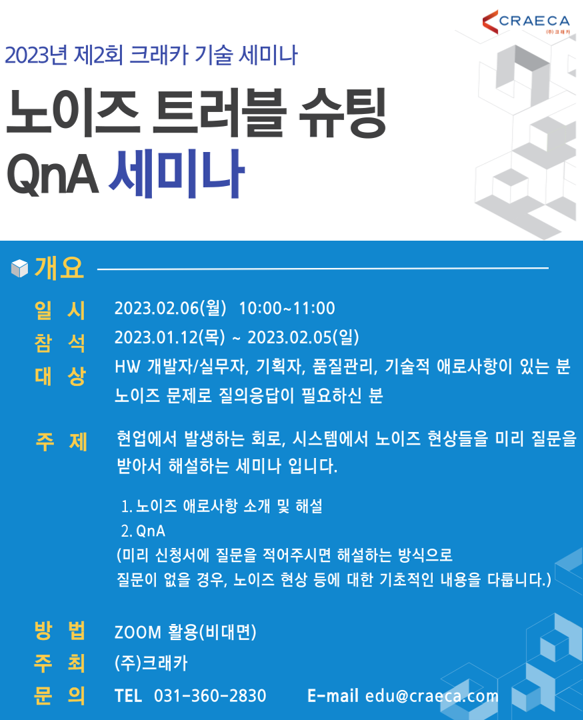 당사에서 현업에서 발생하는 노이즈 트러블 슈팅 문제를 미리 질문을 받아 해설하는 무료 기술세미나를 개최합니다.