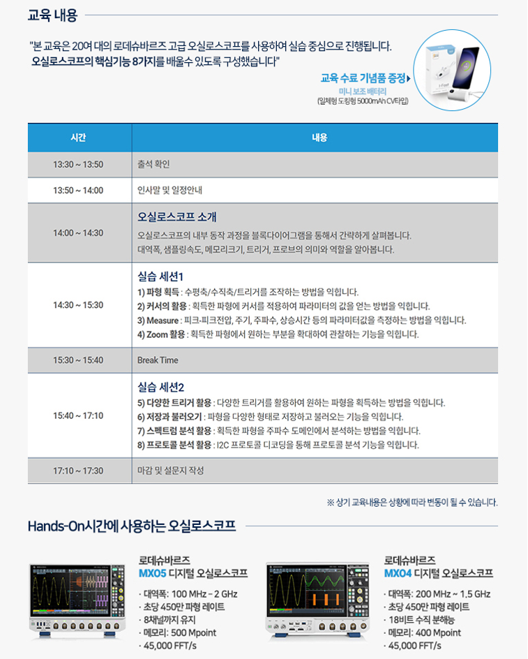 "본 교육은 20여대의 로데슈바르즈 고급 오실로스코프를 사용하여 실습 중심으로 진행됩니다. 오실로스코프의 핵심 기능 8가지를 배울 수 있도록 구성했습니다."