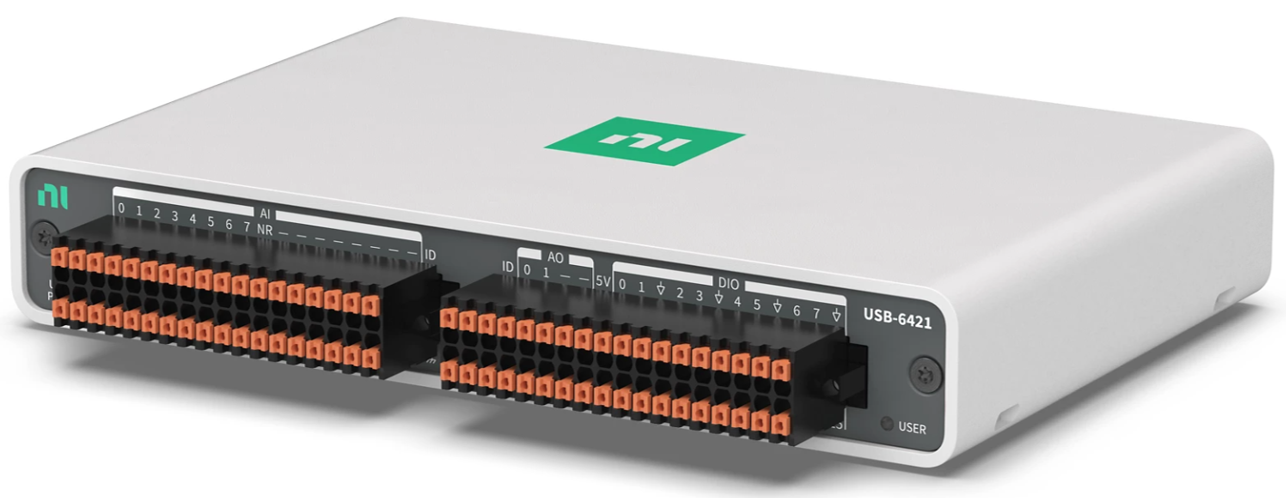 USB-6421은 아날로그 I/O, 디지털 I/O, 4개의 카운터가 있는 USB C 타입 버스 전원공급 mioDAQ 디바이스입니다. ± 200 mV ~ ± 10 V의 입력 범위 셋팅이 4개 있는 아날로그 입력 채널과 업데이트 속도가 250 kS/s/ch인 경우 ± 10 V를 출력할 수 있는 아날로그 출력 채널을 제공합니다. 또한 USB-6421 디지털 I/O 채널은 정적 입력 또는 출력 채널, 최대 10 MHz의 하드웨어 타이밍에 의한 채널 또는 4개의 온보드 카운터의 트리거, 클럭 또는 I/O로 작동할 수 있습니다. USB-6421은 NI의 무료 데이터 수집 소프트웨어인 FlexLogger Lite도 지원하며 LabVIEW, Python, C/C++ 등의 문서화된 API 및 예제를 포함합니다.