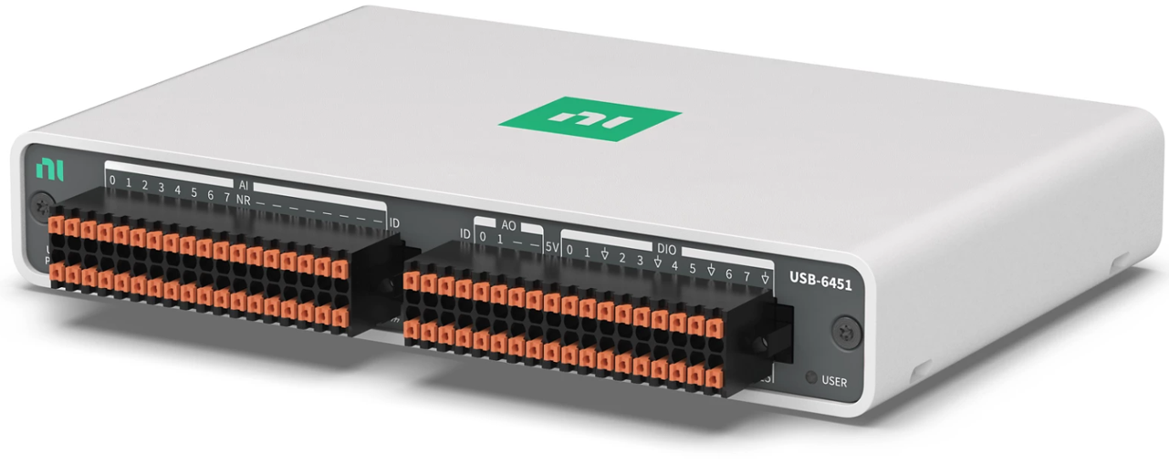 USB-6451은 아날로그 I/O, 디지털 I/O, 4개의 카운터가 있는 USB C 타입 버스 전원공급 mioDAQ 디바이스입니다. ± 200 mV ~ ± 10 V의 입력 범위 셋팅을 가진 8개의 아날로그-디지털 변환기(ADC)를 사용하여 측정의 분해능을 최적화할 수 있습니다. 아날로그 출력 채널은 업데이트 속도가 250 kS/s/ch인 경우 ± 10 V를 출력할 수 있습니다. 또한 USB-6451 디지털 I/O 채널은 정적 입력 또는 출력 채널, 최대 10 MHz의 하드웨어 타이밍에 의한 채널 또는 4개의 온보드 카운터의 트리거, 클럭 또는 I/O로 작동할 수 있습니다. USB-6451은 NI의 무료 데이터 수집 소프트웨어인 FlexLogger Lite도 지원하며 LabVIEW, Python, C/C++ 등의 문서화된 API 및 예제를 포함합니다.