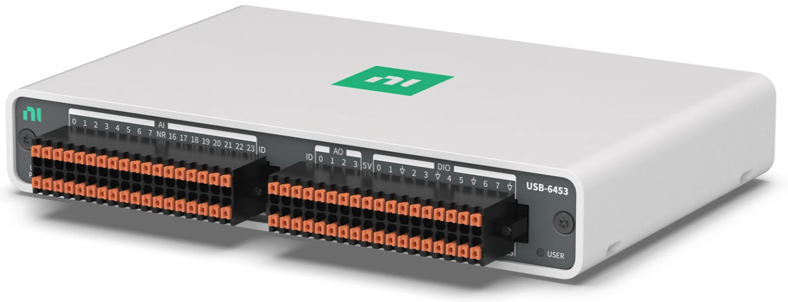 USB-6453은 아날로그 I/O, 디지털 I/O, 4개의 카운터가 있는 USB C 타입 버스 전원공급 mioDAQ 디바이스입니다. ± 200 mV ~ ± 10 V의 입력 범위 셋팅을 가진 16개의 아날로그-디지털 변환기(ADC)를 사용하여 측정의 분해능을 최적화할 수 있습니다. 아날로그 출력 채널은 업데이트 속도가 250 kS/s/ch인 경우 ± 10 V를 출력할 수 있습니다. 또한, USB-6453 디지털 I/O 채널은 정적 입력 또는 출력 채널, 최대 10 MHz의 하드웨어 타이밍에 의한 채널 또는 4개의 온보드 카운터의 트리거, 클럭 또는 I/O로 작동할 수 있습니다. USB-6453은 NI의 무료 데이터 수집 소프트웨어인 FlexLogger Lite도 지원하며 LabVIEW, Python, C/C++ 등의 문서화된 API 및 예제를 포함합니다.